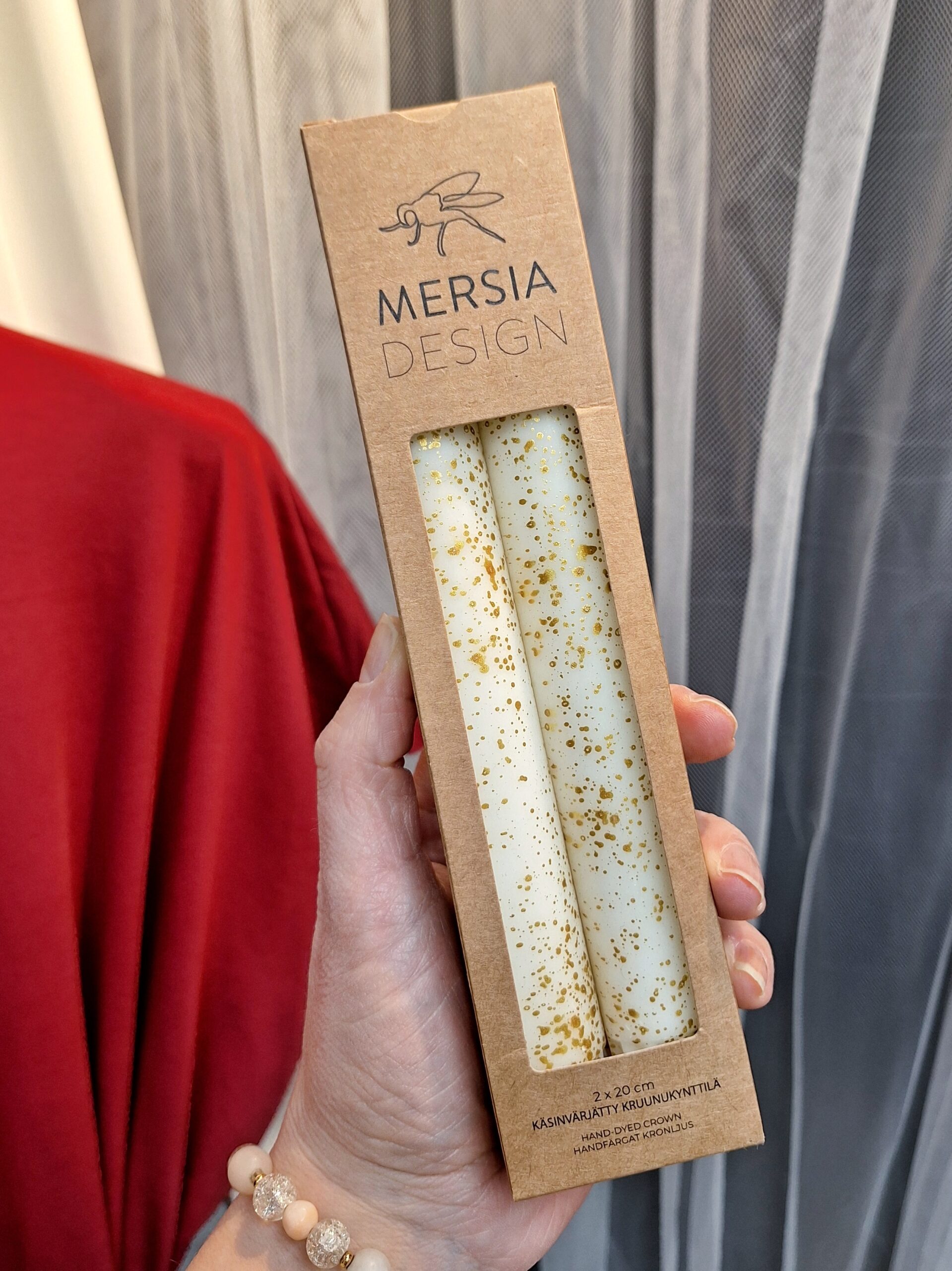 Käsinvärjätyt kruunukynttilät espoolaiselta Mersia Designilta.