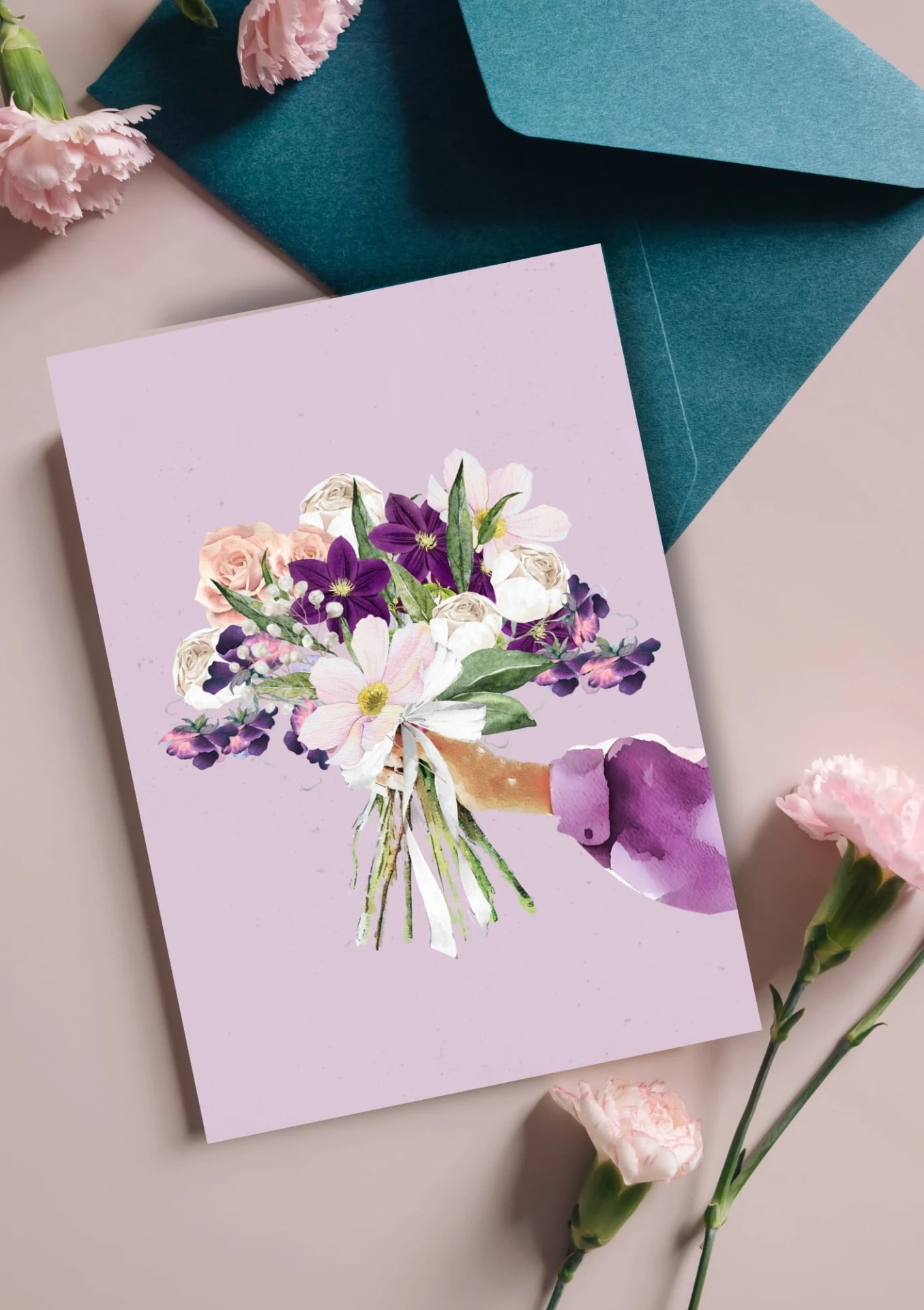 Kaunis kotimainen kaksiosainen Nordic Designin kortti liilan sävyisellä kukkakimppukuvituksella.