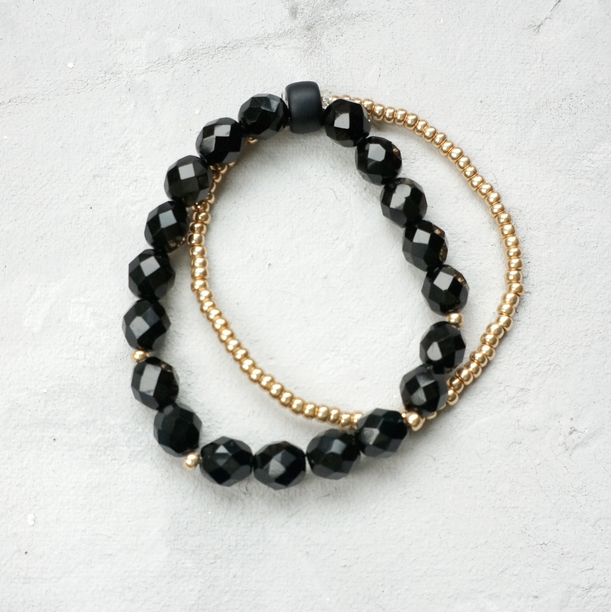 Loiste-rannekoru koostuu kahdesta korusta, jotka on liitetty yhteen liitoshelmellä. Toinen koru koostuu pienistä kulanvärisistä lasihelmistä ja toinen mustista särmikkäistä 8mm lasihelmistä.