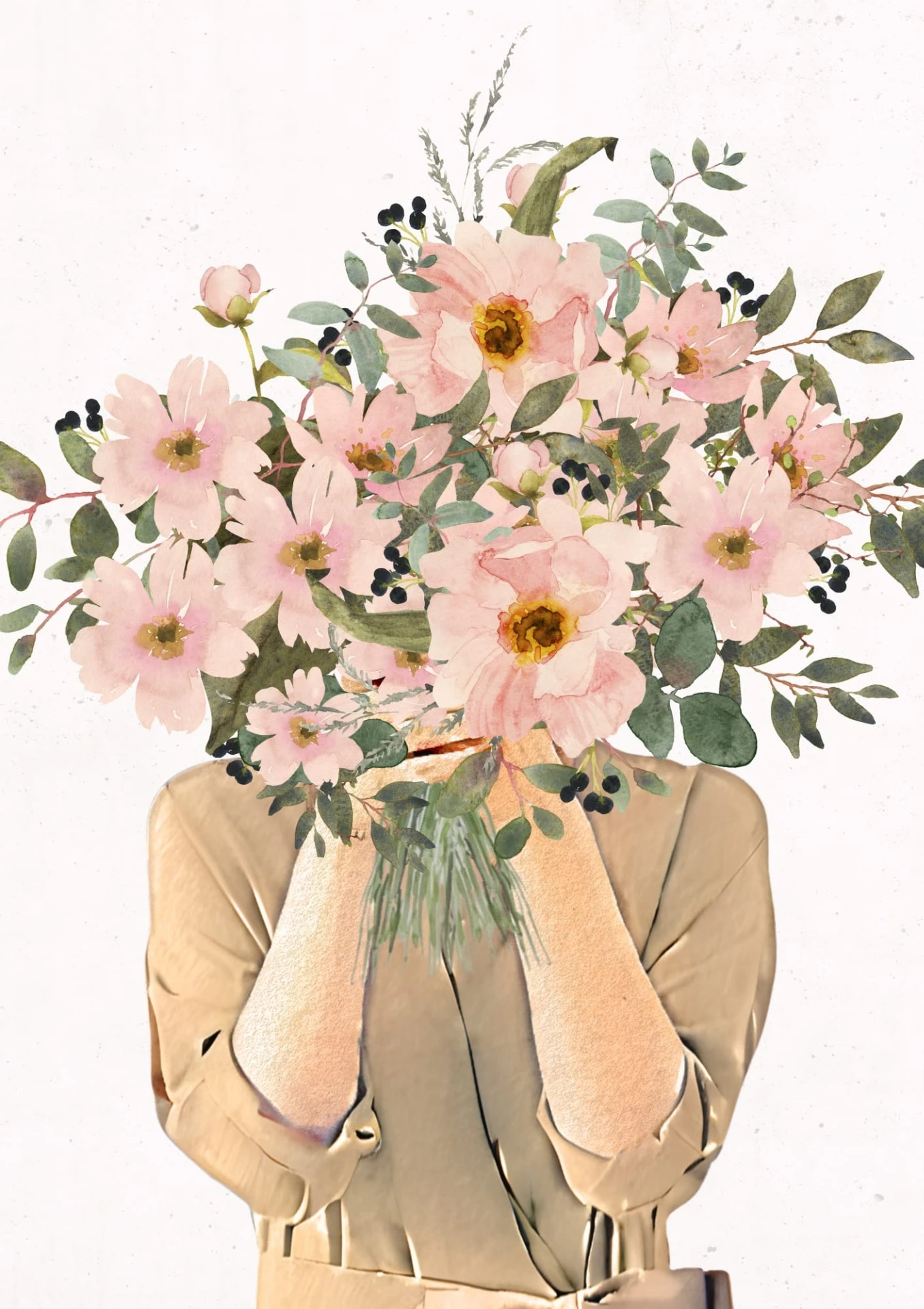 Kaunis kotimainen kaksiosainen Nordic Designin kortti, jota koristaa tyttö ja kukkakimppukuvitus.